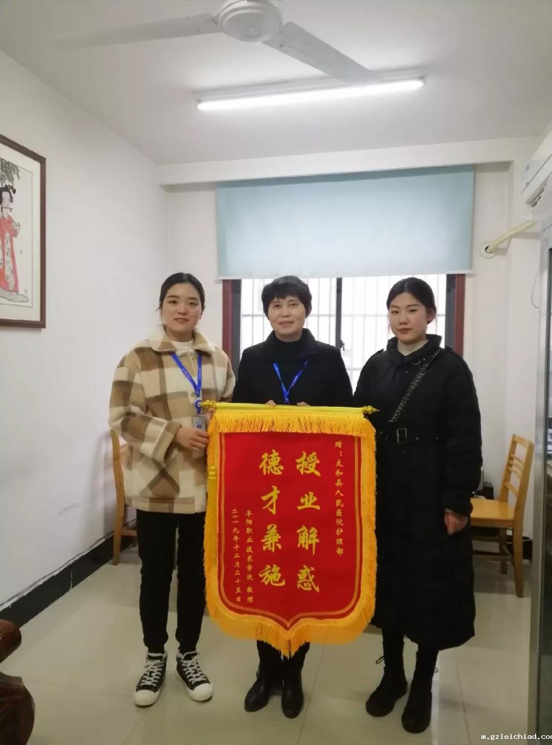 12月25日,淮南职业技术学院、阜阳职业技术学院的实习护士将两面锦旗送至伟德betvlctor官网入口护理部,对着护理部主任周立恒和副主任张彩侠说:“太感谢医院提供的学习平台了,让我们能够潜心学习,还有带教老师对我们的关心、培养和辛勤教导,我们每个人都感动在心!”