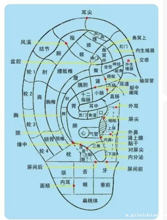 耳穴:顾名思义就是耳朵上的穴位,与人体的脏腑经络相沟通,反映机体生理功能和病理变化,是诊断疾病和治疗疾病的特定点。