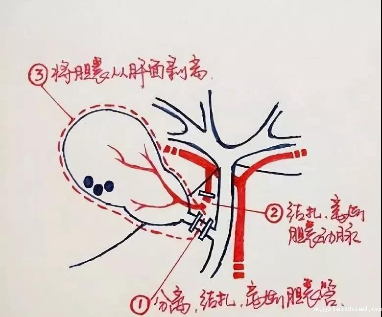 一起看图。只说明一点,胆囊切除的过程,微创和开放手术完全一样。区别在于微创的腹壁穿刺口小,我们会把胆囊放在取物袋里取出,有时因为结石过多过大,或胆囊水肿,我们会把标本剪碎方便取出。但胆囊切除的时候确定是完整的,不是一块一块切除,也不会有残留。