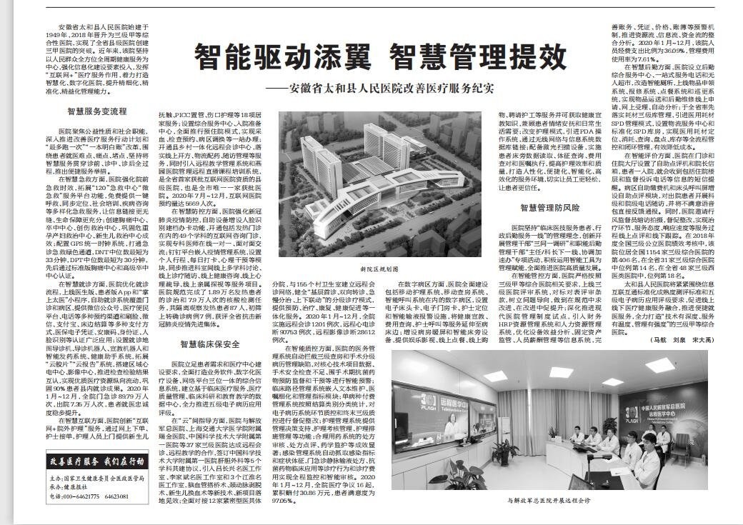 在智慧就诊方面,医院优化就诊流程,上线医生版、患者版App和“掌上太医”小程序,自助就诊系统覆盖门诊和病区,提供微信公众号、医疗便民平台、电话等多种预约渠道和刷脸、微信、支付宝、床边结算等多种支付方式,医保电子凭证、安康码、身份证、人脸识别等认证广泛应用;设置就诊地图导诊机、导诊机器人、宣教机器人和智能发药系统、健康助手系统,拓展“云胶片”“云报告”系统,搭建区域心电中心、影像中心,推进检查检验结果互认,实现优质医疗资源纵向流动,巩固90%患者县内就诊成果。2020年1月-12月,全院门急诊89.79万人次,出院7.35万人次,患者就医忠诚度稳步提升。