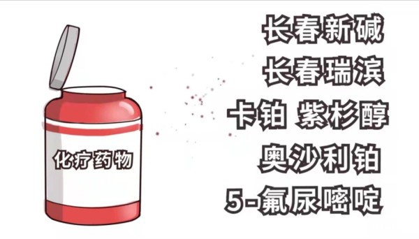 长春新碱、长春瑞滨、卡铂、紫杉醇、奥沙利铂、5-氟尿嘧啶等等。