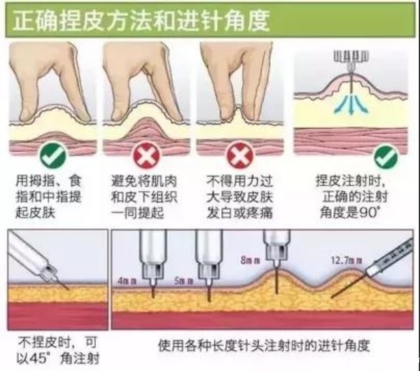 根据胰岛素注射笔用针头的长度明确是否捏皮及进针的角度。绝大多数成人4mm和5mm针头无需捏皮垂直进针即可;