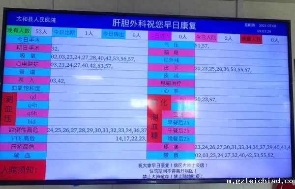 走到病区走廊显示屏,映入眼帘的是今日在院、入院、出院人数,手术患者床号,各种高风险患者,雾化、气压、理疗特殊治疗患者,各种信息一目了然,免去护士查看医嘱本、治疗本的繁琐,有效提高护士的工作效率。