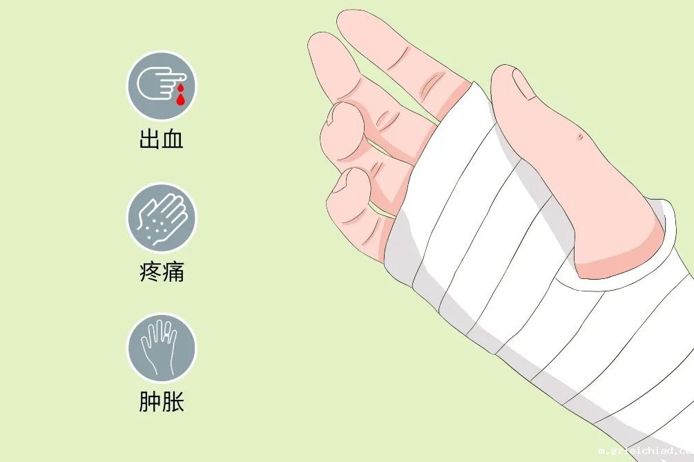 手外伤的典型症状要根据其创伤类型进行区别,开放性损伤常合并出血、疼痛、肿胀、畸形和(或)功能障。闭合性损伤由于皮肤完整,而皮下组织在损伤后严重肿胀,容易导致皮肤将肿胀的软组织紧紧地勒住。