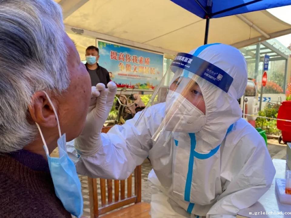 “请把口罩摘下,张大嘴巴……”采样医护人员一边告知居民,一边熟练地拿出棉签,完成采样后将样本放进试管中。随后,立刻进行消毒,为下一次采样做好准备。
