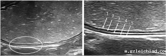 1.高回声(黏膜上皮层);2.低回声(黏膜深层);3.高回声(黏膜下层);4.低回声(固有肌层);5.高回声(浆膜层)