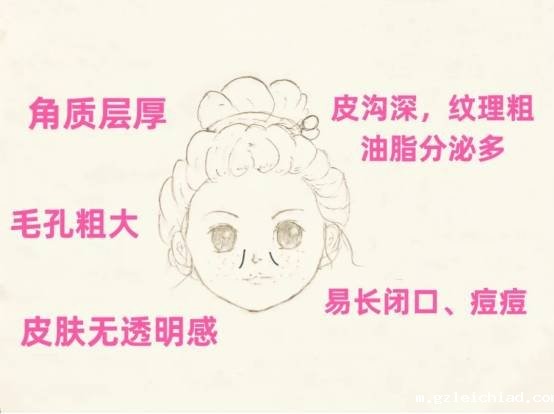 ③油性皮肤:皮脂腺和汗腺特别发达,油脂分泌旺盛,易受细菌感染,易吸取黏附空气中的灰尘,毛孔易堵塞,易长粉刺,毛孔易粗大,容易出现痤疮、脂溢性皮炎等。但却不易老化、产生皱纹。