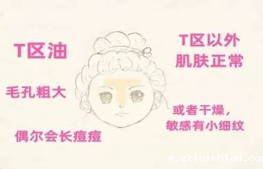 ④混合性皮肤:是干性皮肤和油性皮肤的混合,也称“矛盾肌肤”。常见为T型区为油性肌肤,V型区为干性肌肤。多见于25-30岁年龄的人。