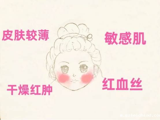 ⑤敏感性皮肤:皮肤一般薄而细腻,脸上的红血丝明显,对外界刺激很敏感,有时可见到红斑、脱屑、红肿等现象。日常不管冷水热水洗脸,都会有刺激不适感,角质层较薄,对护肤品的筛选条件很高,一不小心就会出现脸红等过敏状况。