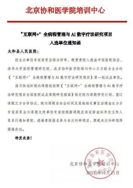 【课题背景介绍】《“互联网+”全病程管理与AI数字疗法》课题由中国医院协会、清华大学医院管理研究院、北京协和医学院培训中心联合主办,北京协和医学院培训中心共同承办,微脉提供技术支持。专家组提供试点运营方案,技术支持单位提供专业技术支持,在伟德betvlctor官网入口组建课题团队,运用“互联网+医疗”新技术打造互联网+全病程管理的“太和样本”。