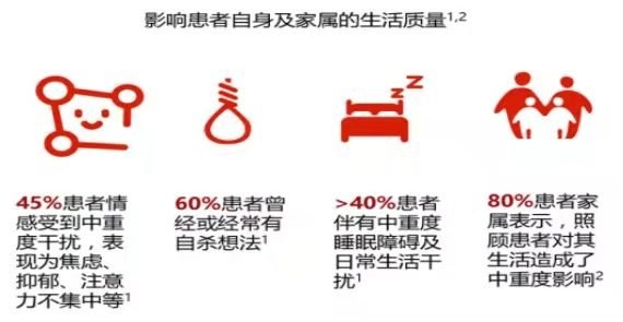 带状疱疹皮疹愈合后仍持续1个月及以上的疼痛即为带状疱疹后神经痛(PHN),是带状疱疹最常见的并发症。约9%~34%的带状疱疹患者会发生带状疱疹后神经痛,30%~50%的带状疱疹后神经痛患者疼痛持续超过1 年,部分甚至达10 年或更长,严重影响患者及患者家属的生活质量。另一种常见并发症是眼部带状疱疹,慢性眼部带状疱疹可导致面部瘢痕和失明。带状疱疹还可导致许多较为少见的其他并发症,例如面神经麻痹、脑炎、脊髓炎、视网膜炎、大脑动脉炎和疱疹后瘙痒。带状疱疹疼痛给患者及家属生活质量带来较大影响。