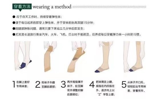 1.早上起床前穿上弹力袜,白天活动时坚持穿至少8小时以上,睡觉时不穿。