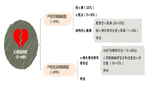 总体来说,心源性猝死中90%的病因为急性心肌梗死。但对于40岁以下的年轻人而言,心源性猝死的病因组成会有所不同。其中70%为结构性病变,另有30%通常由恶性心律失常引起,称为“心律失常性猝死综合征”(SADS)。