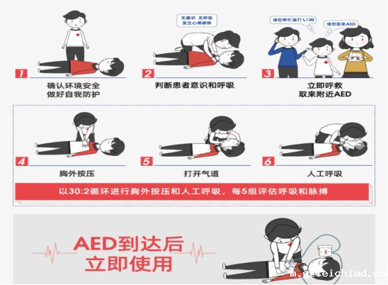 (3)向周围呼救:如患者无回应,自己或让周围人打120,如有自动体外除颤仪(AED),则让周围人取来。