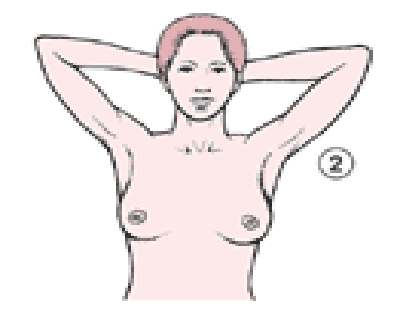 2. 高举上肢继续观察,注意有无乳房皮肤凹陷或橘皮样变,两侧乳头是否对称,乳房外形有无变化。