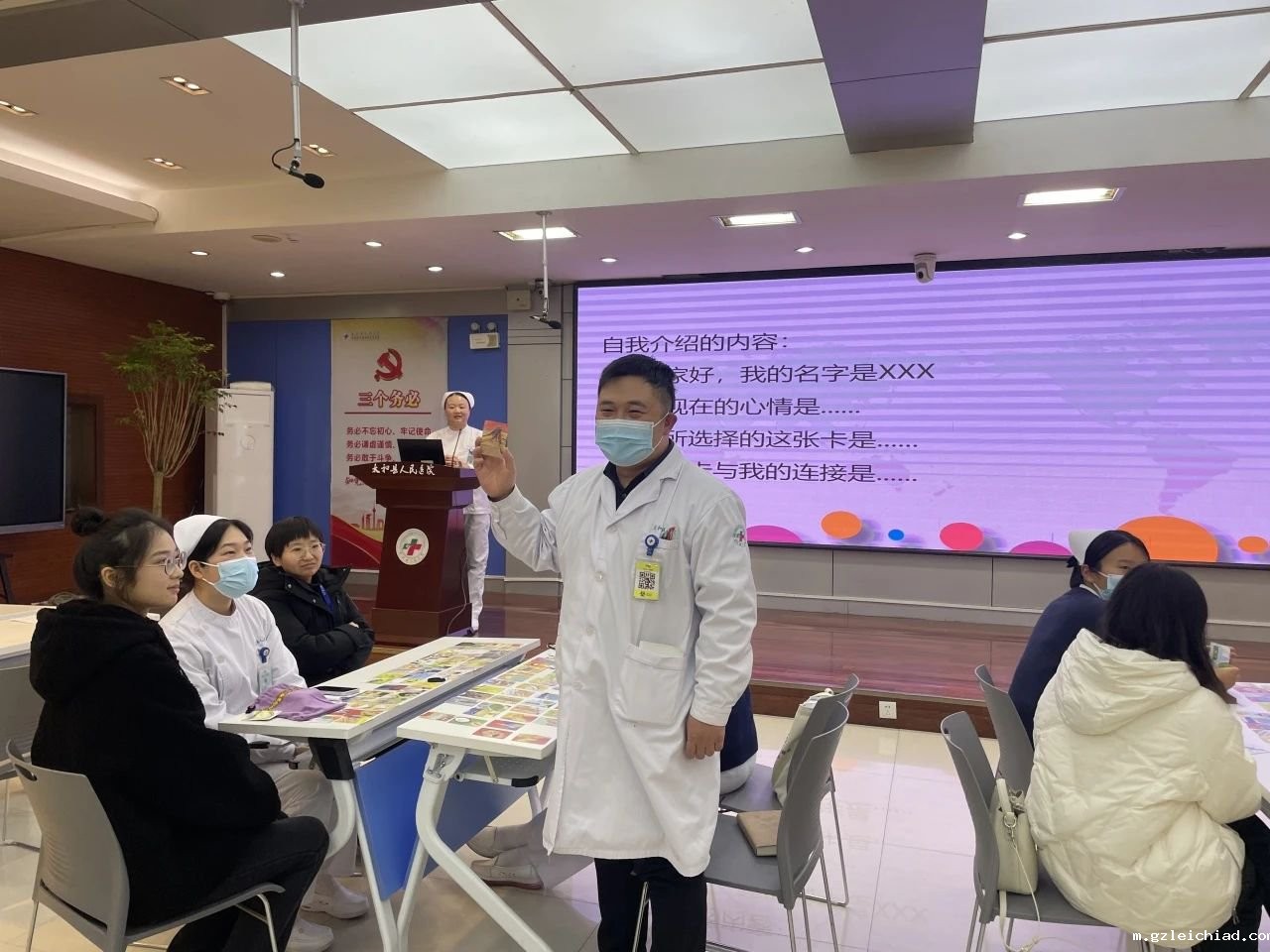 安宁疗护专科护士介绍活动内容—OH卡牌,OH卡片是一种自由联想及潜意识投射的系统,每个人抽取OH卡牌进行自我介绍和故事接龙,在描述卡牌的同时发现自己内心深处的情绪,建立情绪发泄的出口,找到情绪的真正源头。OH活动中,大家打开心结心扉,畅所欲言,抛开一切心理束缚,分享自己的工作生活中的顾虑,压力来源等,说到动情处,甚至相拥而泣,充分释放了自己的压力。