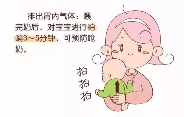 喂完奶后,将宝宝直立扒在肩膀上或坐立式拍嗝,空心掌轻拍宝宝的背部帮助其排除胃内空气,最好听到打嗝,再右侧放在宝宝床,半小时后再平躺或左侧。
