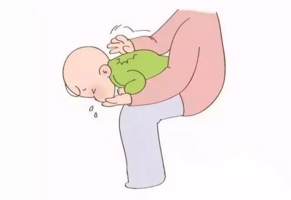 在进行5次拍背后,将手放在婴儿背部,用手掌托住宝宝后脑,将宝宝完全抱在两臂之间,一只手掌托住宝宝脸部和下颌,另一只手掌托住宝宝后脑。小心托住宝宝头颈,同时将宝宝全身翻转过来,使宝宝面部朝上,自身前臂靠在大腿上,确保宝宝的头部低于躯干部位。