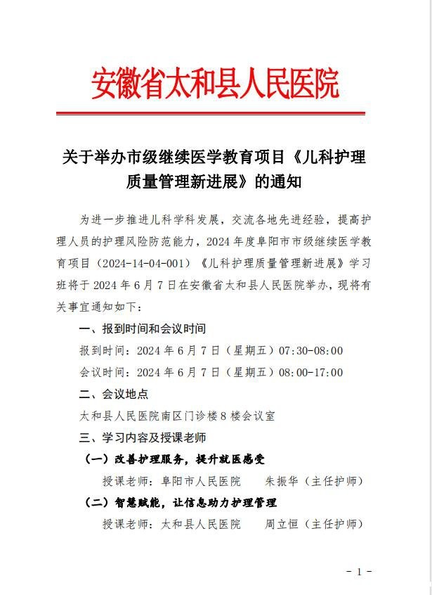 关于举办市级继续医学教育项目《儿科护理质量管理新进展》的通知