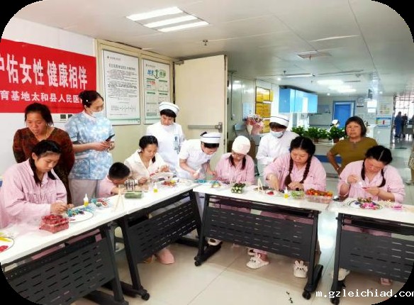 护理部主任周立恒带领产科医护人员现场指导宝爸宝妈手工制作。宝爸宝妈纷纷拿起手中的材料跃跃欲试,在素面扇上摆放着各种材料花进行造型设计,从构图到色彩搭配,再到粘贴制作,大家有条不紊的进行创作,时不时互相交流,现场气氛十分活跃。经过近一个小时的努力,一朵朵花、一片片绿叶在扇面上展现出了独特的风采,素面扇瞬间花团锦簇,每一把都那么别具风情。