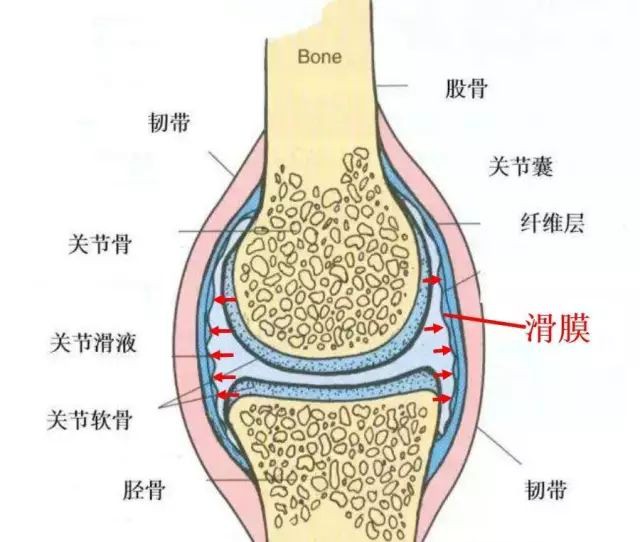 滑膜则是附着在关节腔内壁的一种软组织,如果把关节腔比作一个房间的话,那滑膜就相当于房间里的壁纸,它主要的职责就是负责分泌滑液,也就是给关节分泌润滑剂同时保护关节软骨。