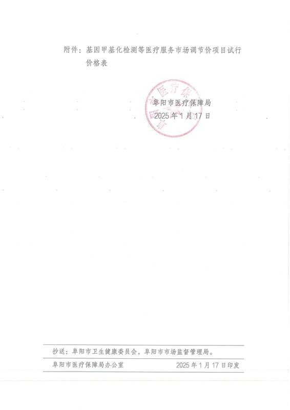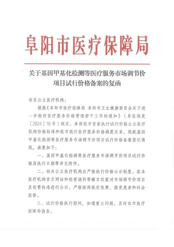 关于基因甲基化检测等医疗服务市场调节价项目试行价格备案的复函