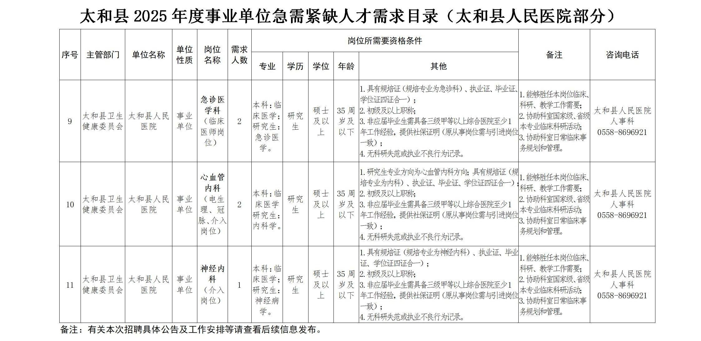 皖公网安备 34122202000155号 技术支持:太和万联网络 为深入贯彻习近平总书记关于做好新时代人才工作的重要思想,认真落实中央、省委和市委人才工作会议部署要求,围绕建设“区域性人才强市先进县”目标,进一步加大招才引智力度,精准引进一批急需紧缺人才,现发布太和县2025年度事业单位急需紧缺人才需求目录,诚邀天下英才来太就业!(转自太和先锋网)